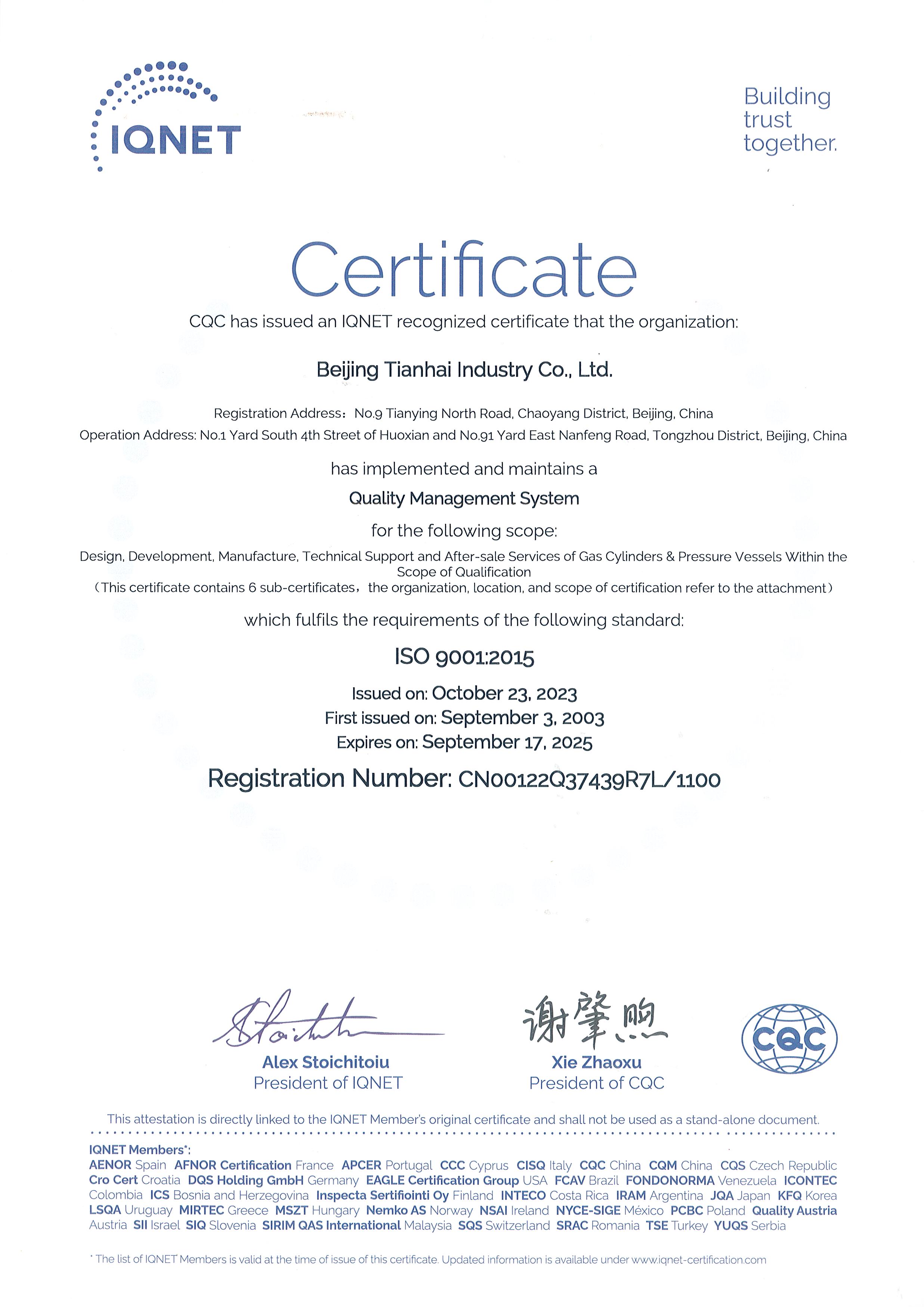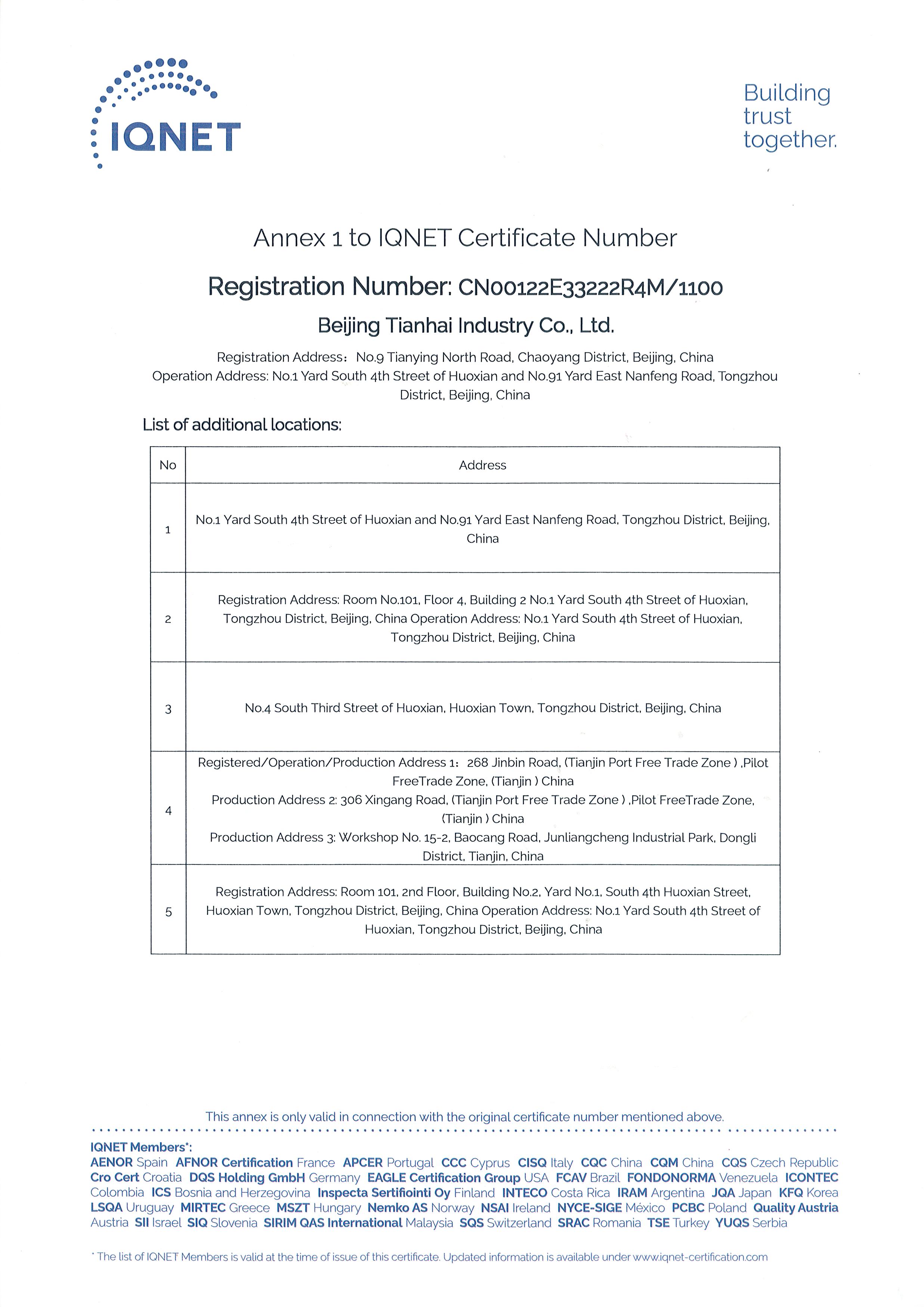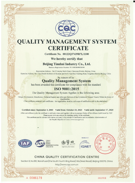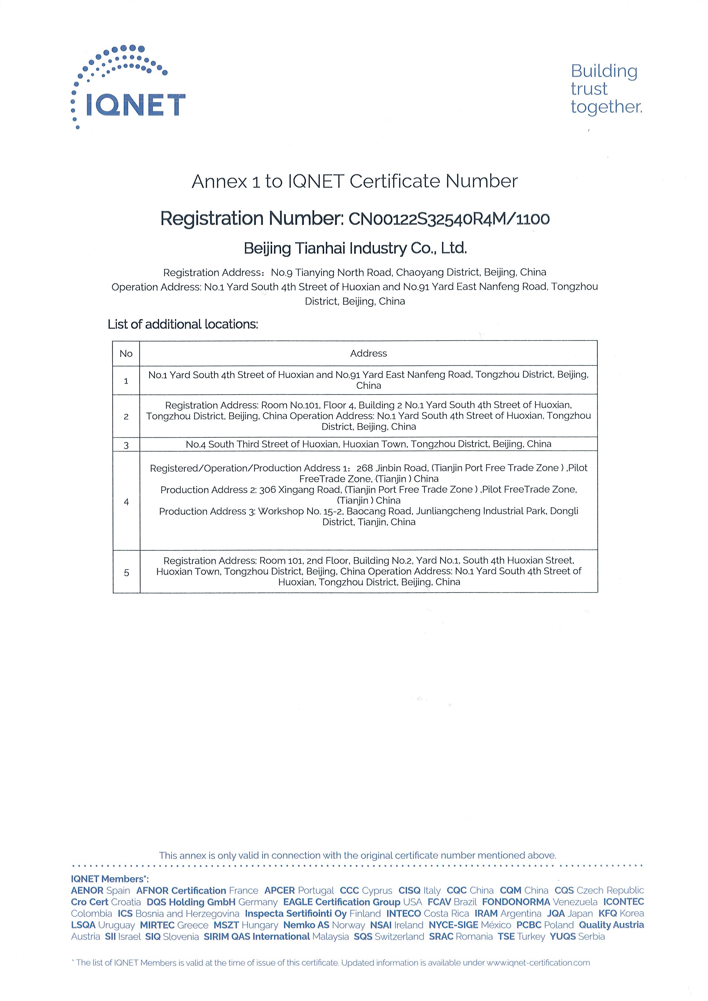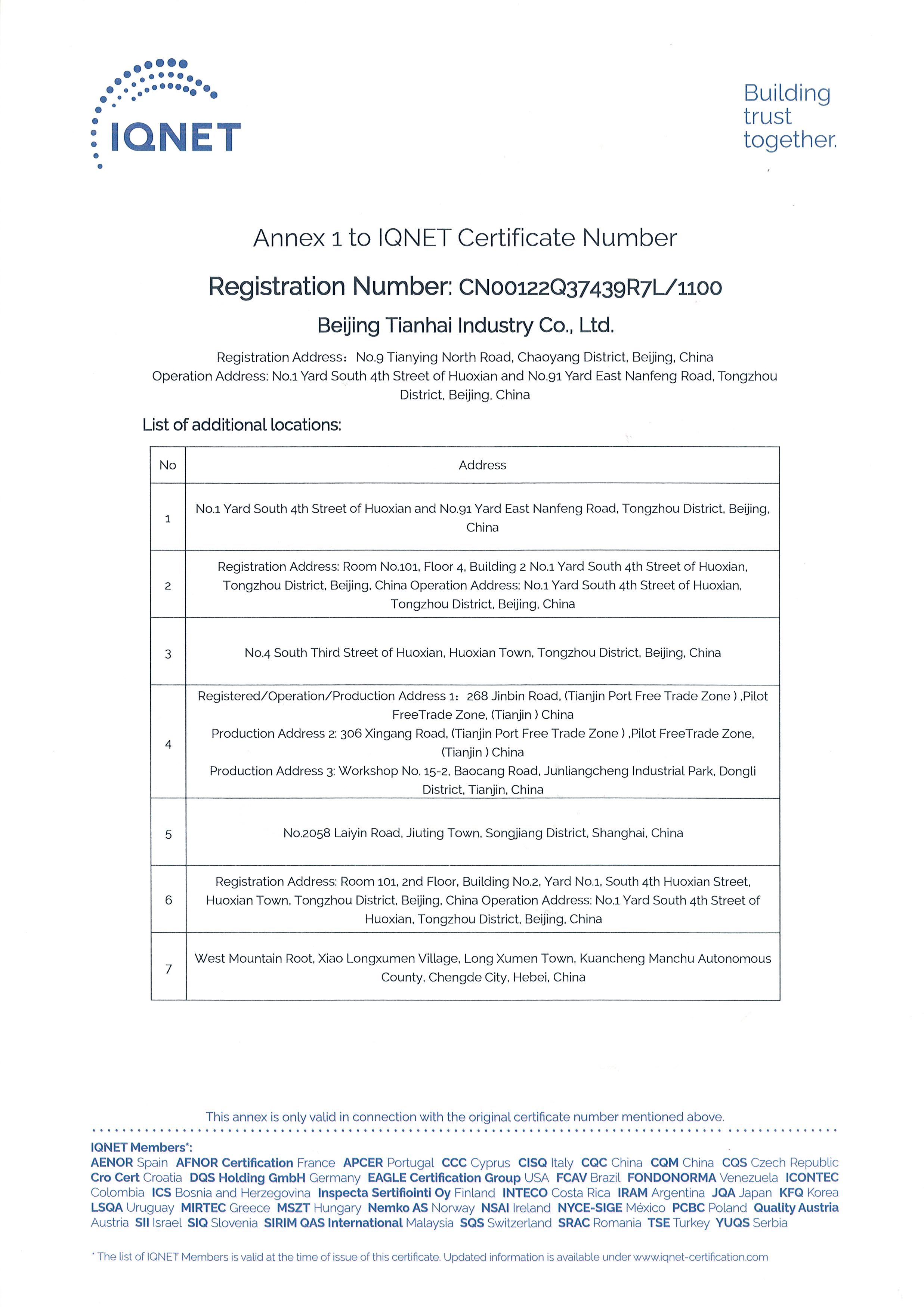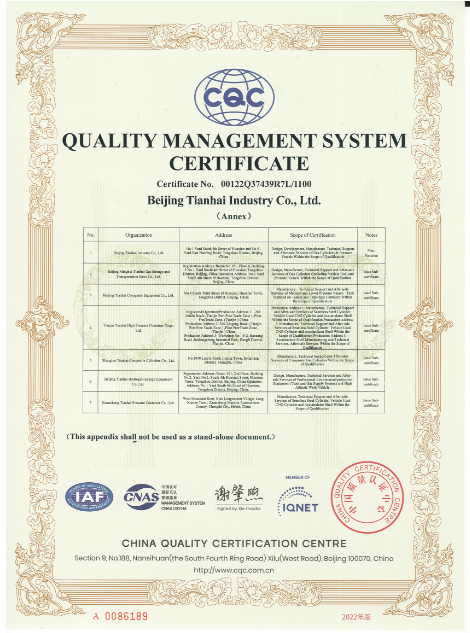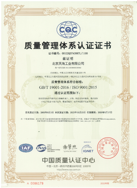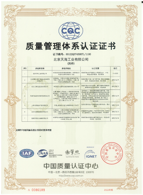 2010年9月,天海工業(yè)為保證品牌質(zhì)量,保證產(chǎn)品一致性,建立了集團(tuán)一體化ISO9001質(zhì)量管理體系,通過(guò)中國(guó)質(zhì)量認(rèn)證中心的集團(tuán)式認(rèn)證并取得證書。